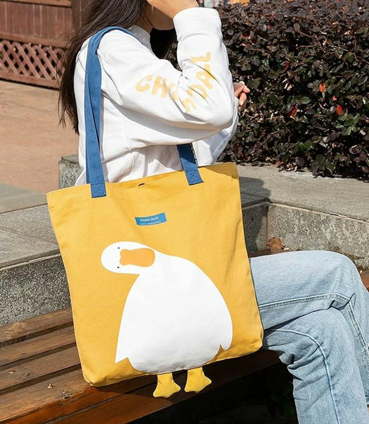 Carry everything from a laptop to a lunchbox in this sweet duck canvas tote bag. Sewn from high-quality canvas material, the yellow tote bag has a blue shoulder strap that’s just under 12 inches long for comfortable wear. It also features a snap button closure and an interior zippered pocket to keep your belongings secure. “The fabric feels durable, the handles are strong, and the fun graphic design gets me lots of compliments,” wrote one reviewer.