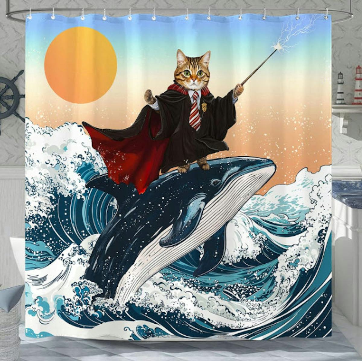 Who said that your shower curtain had to be boring? This magnificent polyester fabric shower curtain features a cat and whale, is water-resistant, and has 12 metal grommets for easy hanging. It has a standard 72-inch-by-72-inch size and is machine-washable, promising that the colors will stay vibrant even after multiple washes.