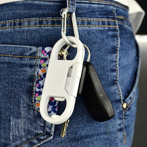 This keychain bottle opener is about to become an item you reach for several times a day. First, it’s a bottle opener. But it also has an iPhone lightning cable hidden in the handle. Pop out the cables. Plug one end into a powered USB plug and the other into your phone. It clips to your belt or keychain so you always have it with you.