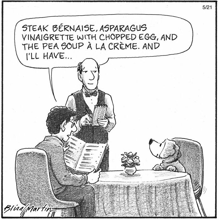 If you wonder how a typical day of a cartoonist looks like, Harry Bliss shared his routine with us: "Well, I’m usually up at 6:30 in the morning. I read for an hour in bed, play Wordle, then wake up to let the dog out. We play fetch across the street and then head in for breakfast. I read some more until about 10 AM. After that, I sit at my desk working on cartoons until noon. At noon, if it’s not too hot, we go for a nice hike in the woods. I tend to my garden, which is a kimchi garden. I’m dealing with slugs at the moment—they love my Napa cabbage! I don’t eat lunch. I work again from 6 to around 7:30 or 8 PM. I’m always jotting things down in my journal, often throughout the day. Sometimes, cartoon ideas come from there. I have countless drawings of my dog, Junior. I’ve been doing this for the past 15 years and it’s very rewarding. I have the best fountain pen ever, and I love to see the ink flow from it. Mont Blanc—amazing!"