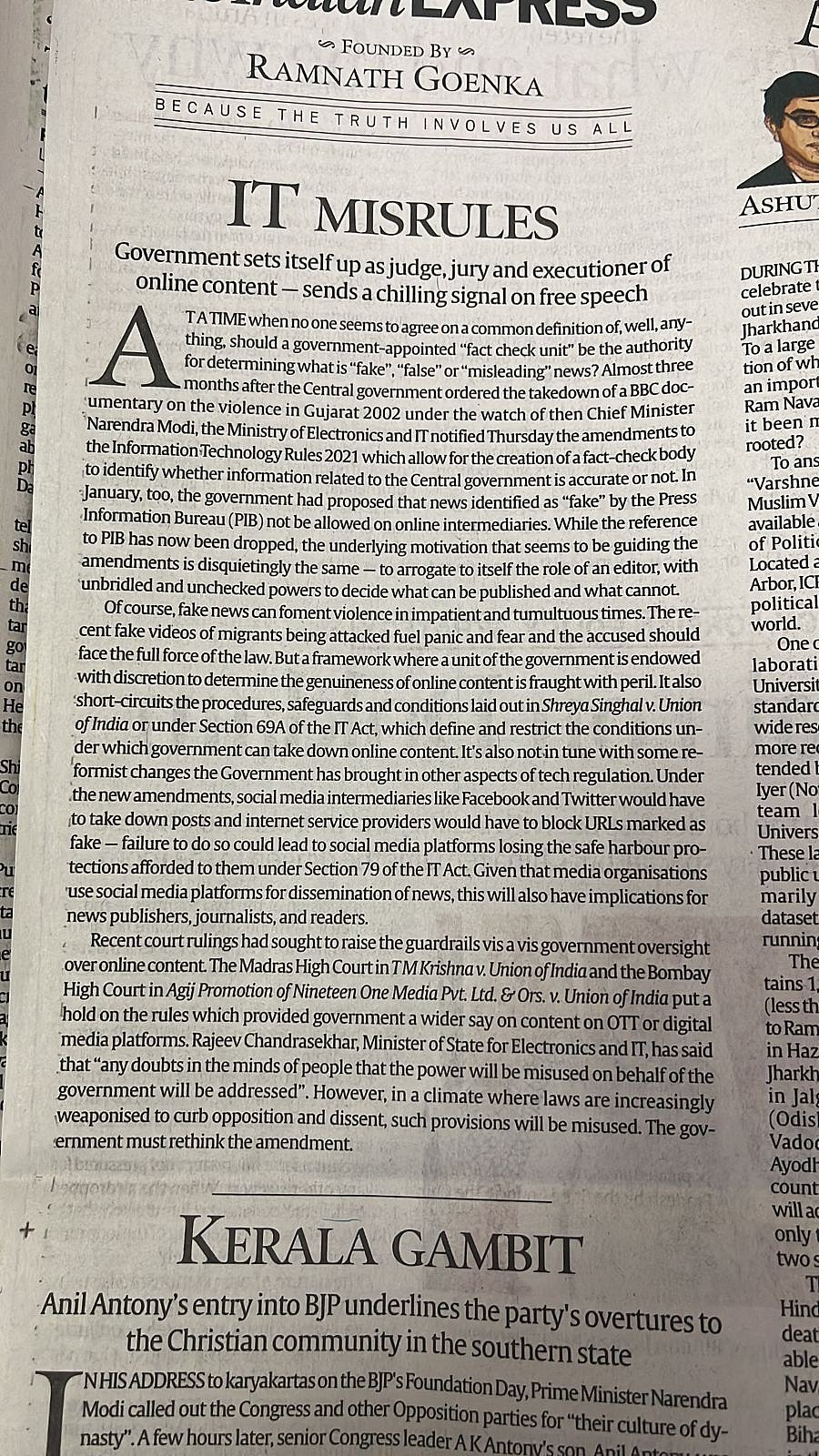 एक्सप्रेस ने कहा, "हालांकि, एक व्यवस्था, जहां सरकार की एक इकाई को ऑनलाइन सामग्री की वैधता निर्धारित करने का विवेकाधिर होगा, जोखिम भरा हो सकता है. श्रेया सिंघल बनाम भारत सरकार और आईटी एक्ट मामले में भी ऐसी "शॉर्ट-सर्किट" प्रक्रियाओं का उल्लेख है. हालांकि, ऐसे माहौल में जहां विरोध और असहमति को रोकने के लिए कानूनों को तेजी से हथियार बनाया जा रहा है, ऐसे प्रावधानों का दुरुपयोग संभव है."
