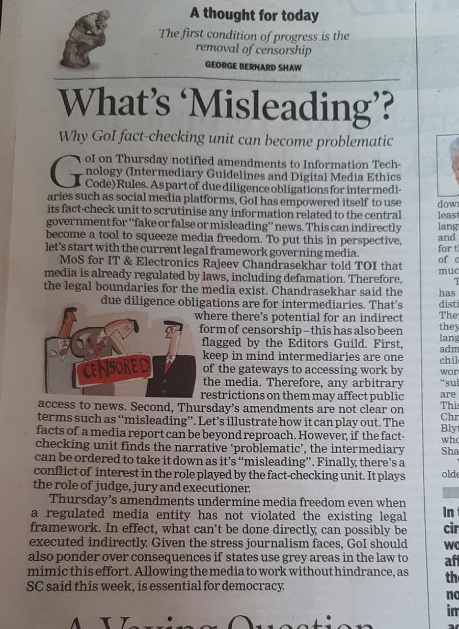 टाइम्स ऑफ इंडिया ने भी इस विषय पर संपादकीय लिखा है. अख़बार ने इशारा करते हुए कहा कि खुद राज्यमंत्री चंद्रशेखर ने टाइम्स ऑफ इंडिया को बताया था कि मीडिया पहले से ही कानूनों के जरिए नियमित है और ये नया संशोधन मध्यस्थों के लिए है, मीडिया के लिए नहीं.