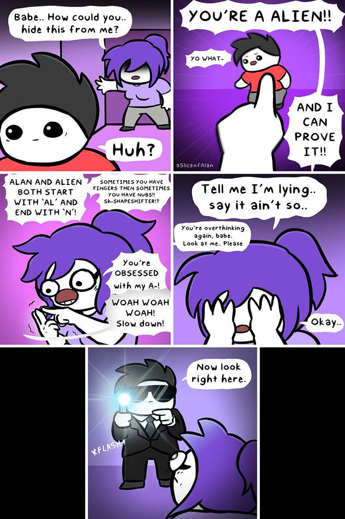 "A Slice of Alan" comics will keep you entertained with dark and raunchy storylines and humor that has no filter, depicting the artist's relationship with his wife. As Alan himself wrote: "My comics are mostly exaggerated expressions of love for my wife. A love letter expressed in comics. I show her the final drafts before I post them, and she loves them every time. I post the comics because I love my creations, and if people like them and feel the same about someone else as I do for my wife, then that's great. If not, that's also great."