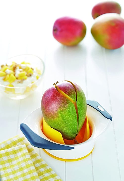 Everyone seems to have their own trick for cutting up mangoes, but here's a tool that can make it even easier. The serrated blades cut around the pit, and the peeler helps to remove the skin. So the next time you're craving some sliced fruit, you can skip the part where you're trying to wrangle a slippery pit and get right to the good stuff — eating the mango.