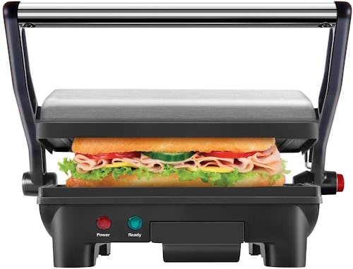 With a design similar to a waffle iron, this panini press-grill hybrid is a versatile and budget-friendly kitchen tool. You can use it open as a grill or you can flip one side over the other to press sandwiches. Since it does double-duty, it's great if you don't have a ton of storage space. The nonstick grill plates and drip tray help to keep messes to a minimum, too.