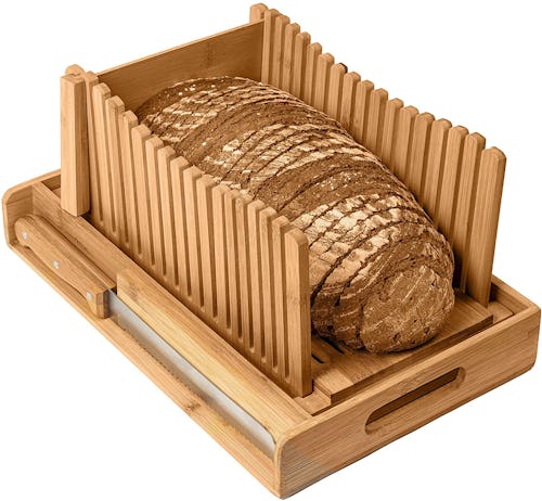 I've had more close calls trying to cut up sourdough loaves than I'd like to admit, which is why I'm definitely eyeing this bread slicer. It is constructed from bamboo wood, and it features evenly spaced slots to pass the included knife through. One reviewer commented, "We use this to slice sourdough loaves with irregular shapes and it works well. [...] The slicer guide is well built and easy to use. We like that it folds up flat for storing." Another wrote, "If you want evenly sliced bread this [is] the slicer for you."