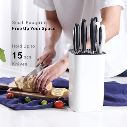 This knife block is designed to hold knives measuring up to 8.9 inches long, and can store as many as 15 knives at a time (as well as a pair of kitchen shears and a sharpening rod). One reviewer attested: "Bought this for all of our knives. It fits any size nice and scissors. It is nice looking and very sturdy." It also comes in a clear round version and a bamboo version.