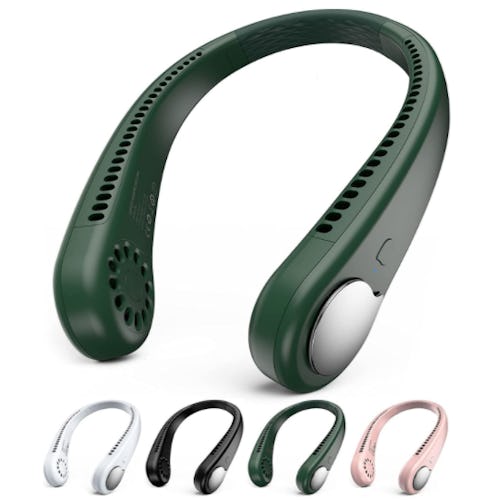 On warm days, loop this portable fan over your shoulders to cool off your neck and face. It has three different speeds and the rechargeable battery can run up to 16 hours on one charge at the lowest setting. It comes in this dark green color, as well as light gray and pink versions.