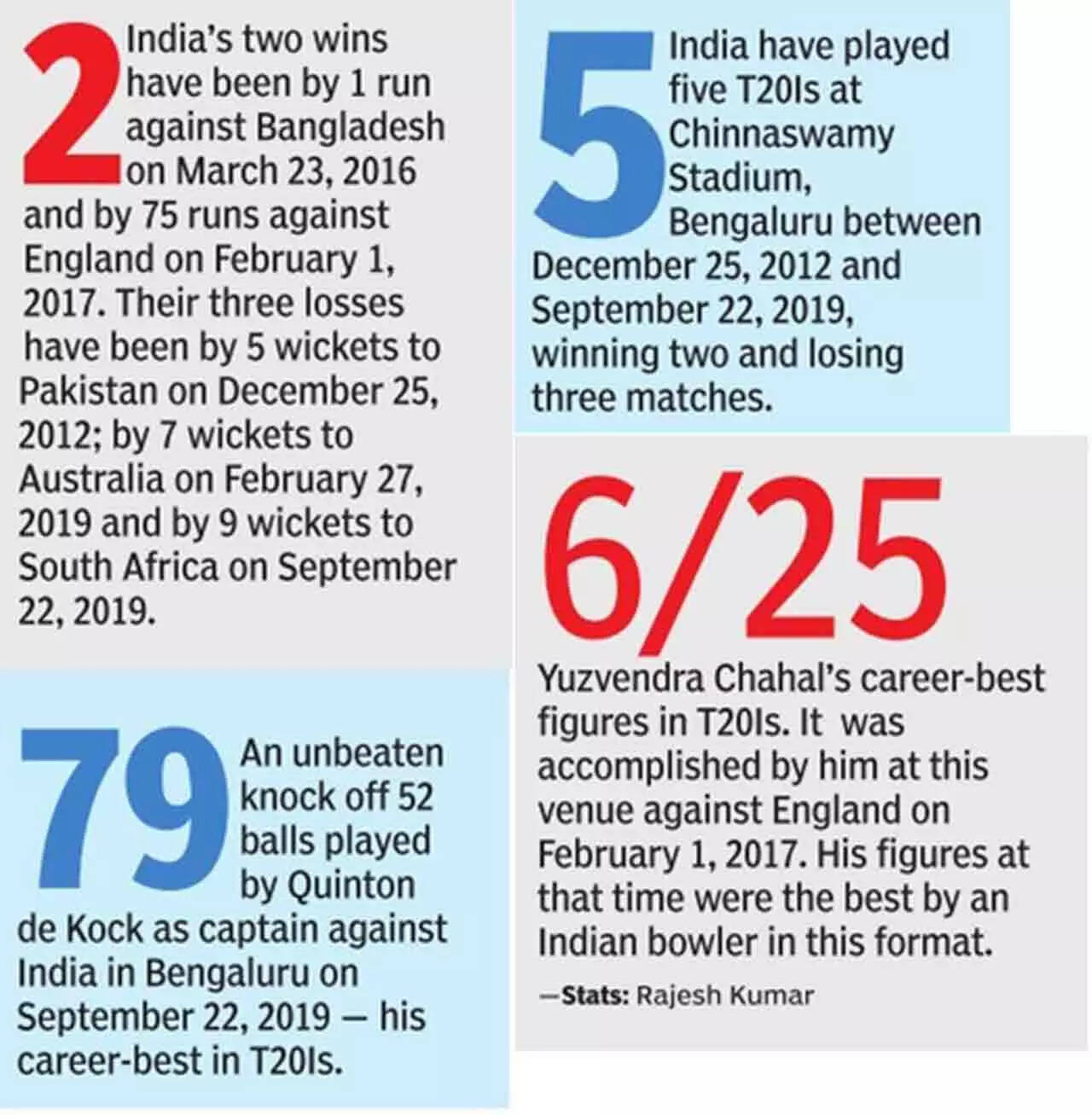 Having piloted India's charge with a 27-ball 55 in Rajkot on Friday night, Karthik will look to play his part at 'home' in the series decider at the M Chinnaswamy stadium on Sunday night. RCB have a loyal legion of supporters and they will expect fireworks from Karthik, in the first T20 contest here since September 2019. The last match played here was incidentally between the same two sides with the visitors winning by nine wickets.