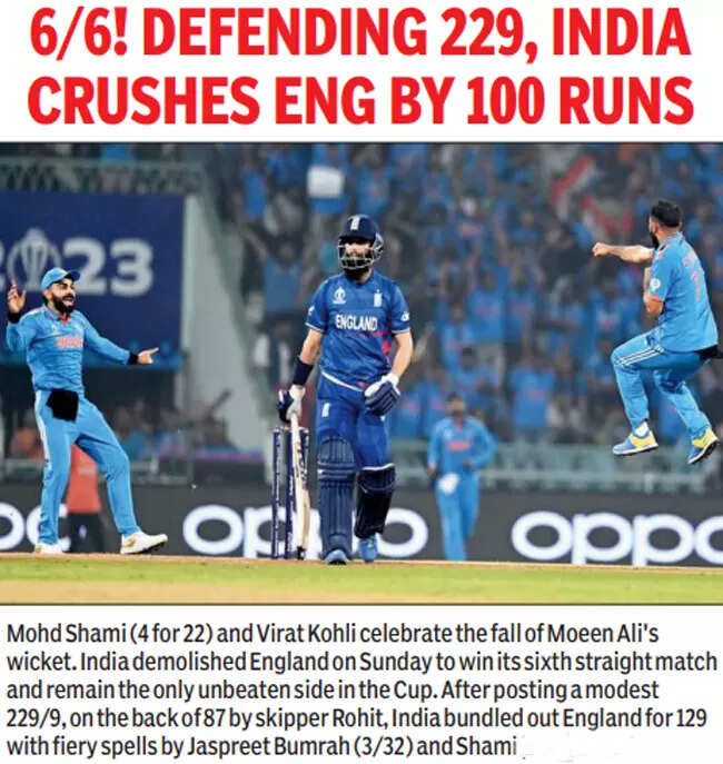 LUCKNOW: India’s World Cup campaign officially gained invincibility status on Sunday. Poor England. Down and out on their luck, they were seemingly having a good time until first Jasprit Bumrah (3/32 in 6.5 overs) and then Mohammed Shami (4/22 in 7) — those two fiery, relentless avenging angels of pace and fizz and seam and genius —