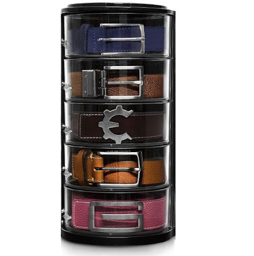 A quick glance at this belt organizer and you’ll know exactly where to find the style that you’ve been looking for. You can roll up and tuck five belts in its own clear drawer with a pull handle. It even rotates 180 degrees so that you can plan out your outfit from any angle. It can be stacked with additional units or mounted on a wall.