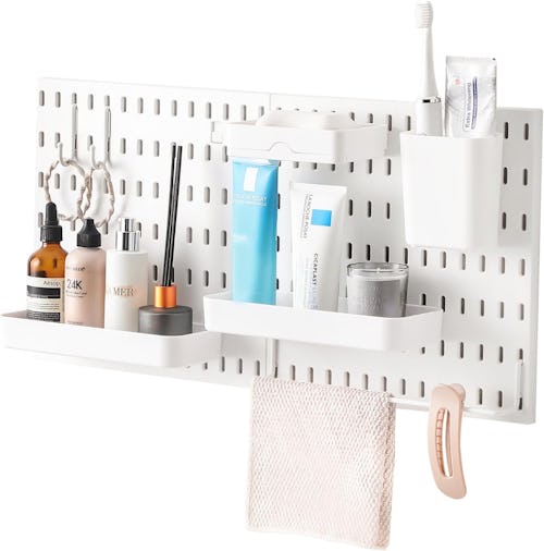From the two pegboard panels to the shelves, every part of this bathroom wall organizer is customizable. You can decide just how big to make it so that it can complement your space. In addition to the ordinary shelves, it also comes with a toothbrush holder, sponge holder, pack of hooks, and towel rack. Install it with the included screws or sticky pads.