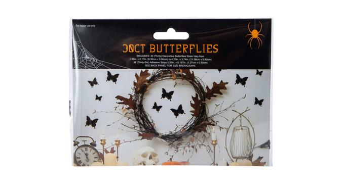 This 30-count set includes decorative butterflies in various shapes and 36 adhesive strips to attach them. Peel and attach to the backsplash in a kitchen or front entryway or decorate a dorm room wall with a spooky wreath as a centerpiece, per the packaging’s suggestion.