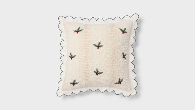 Give your living room or bedroom a cozy holiday vibe with this decorative throw pillow featuring embroidered mistletoe and scalloped edges.