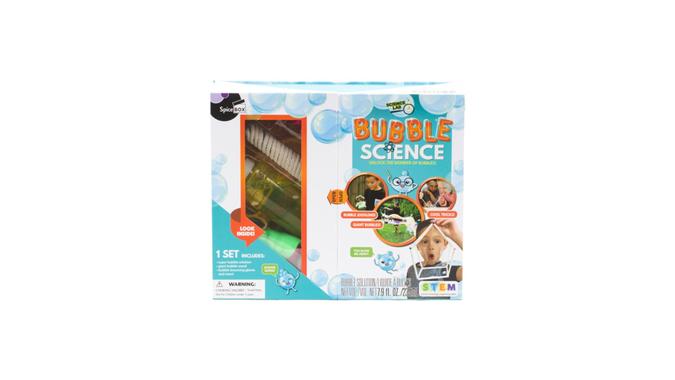 The SpiceBOX stem bubble science kit includes a project book, two bubble-bouncing gloves, bubble blower and tray, giant bubble wand, super bubble wand, 12 pipe cleaners, 12 straws, 30 assorted beads and bubble solution. Grandkids will enjoy creating different types of bubbles and learning tricks, including how to juggle bubbles.