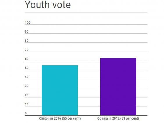 Exit polls suggest Clinton did not succeed in winning the youth vote, to the extent that her predecessor did. Fifty-five per cent of young people aged 18-29 supported her, far short of the 63 per cent support which contributed to Obama's victory in 2012.