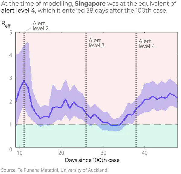 But the virus has bounced back. Infection clusters originating among migrant workers has prompted tighter restrictions. The Reff currently sits at around 2, and Singapore still has a lot of work to do to bring it down.