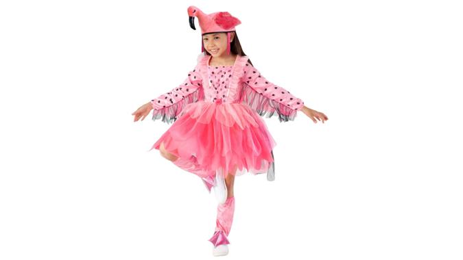 Your kiddo is sure to win costume contests for originality in a Teetot pink flamingo costume. This online-only ensemble comes with a flamingo pink dress and multi-layer skirt, headpiece and pink foot cuffs with webbed feet. Choose from a variety of child’s sizes while supplies last.