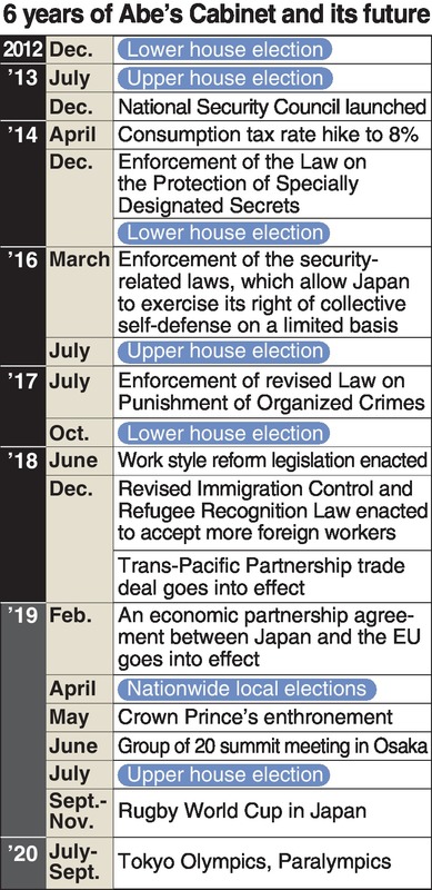 Six years have passed since Prime Minister Shinzo Abe's second Cabinet was inaugurated in December 2012. Since making a comeback in that year, he has overseen three consecutive wins in House of Representatives elections, achieving a total of five consecutive national election wins (including House of Councillors elections) as the president of the Liberal Democratic Party, and maintaining a strong sense of unity.