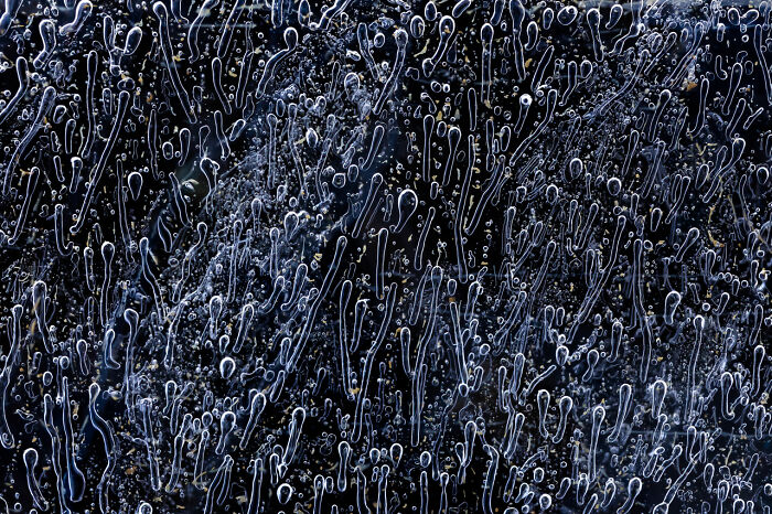 "With the arrival of the first warm days of spring, the spawning season of common frogs begins. Frogs gather in ponds, lakes, and other waters to find a mate and lay their clumps of eggs, which float on the surface. After about two to three weeks, the tadpoles hatch, and the cycle of transformation begins. In their first days, they cluster near the surface, feeding on the remnants of their eggs, which creates an ideal moment for observation and photography. One sunny day, I returned to my local pond, where I had found many clumps of eggs weeks earlier. The tadpoles had just hatched, and small air bubbles shimmered on the surface. I set up my tripod above the water, hoping to capture both elements in a single composition. Eventually, I found a section where one half of the frame held a cluster of bubbles and the other half a gathering of tadpoles. To soften the contrast, I used my hand to shade the sunlight and create more even lighting. With this photograph, I hope to draw attention to the declining spawning grounds of frogs and toads. In the weeks that followed, very little rain fell, and the water level in this pond dropped dramatically, threatening the survival of the tadpoles. Unable to watch them dry out, I carefully relocated them to a nearby pond, hoping to give them a better chance to continue their journey."