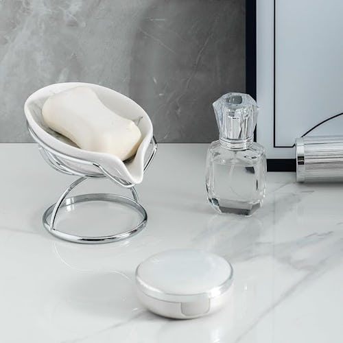 This leaf-shaped soap dish is elevated on stainless steel legs and features a neat little spout that allows any access water to self-drain directly into your sink to prevent a soggy bar of soap. It blends really nicely into nearly any decor style, and the base is slightly weighted to add stability when you’re washing your hands.