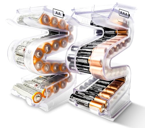 These battery storage containers have an S-shaped design that automatically dispenses batteries one at a time, insuring you’re using the oldest one first so you can keep them fresh. They can store up to 20 AA and 28 AAA batteries, respectively, and they’re stackable to take advantage of often overlooked vertical storage space.