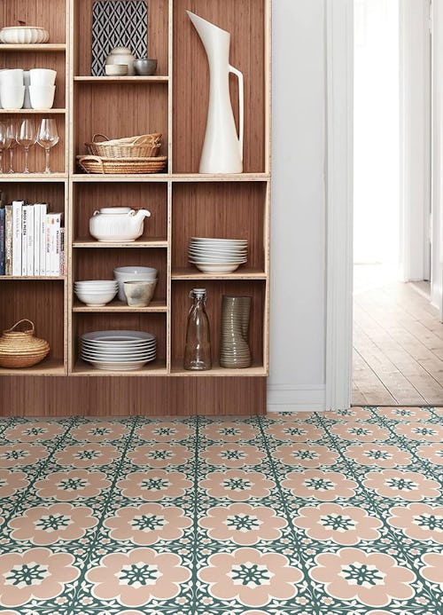 Using peel and stick floor tiles are a great way to instantly refresh your space without spending money on a pricey renovation. They’re made of a vinyl material with a textured, low luster finish and .06 inch thickness that gives them a nice substantial weight to them that feels expensive. Each pack contains 10 tiles that cover 10 square feet in a pink and floral design.