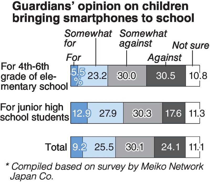 Sixty percent of elementary school students' parental guardians are against children bringing smartphones to school, a nationwide online survey conducted by Tokyo-based cram school operator Meiko Network Japan Co. shows.