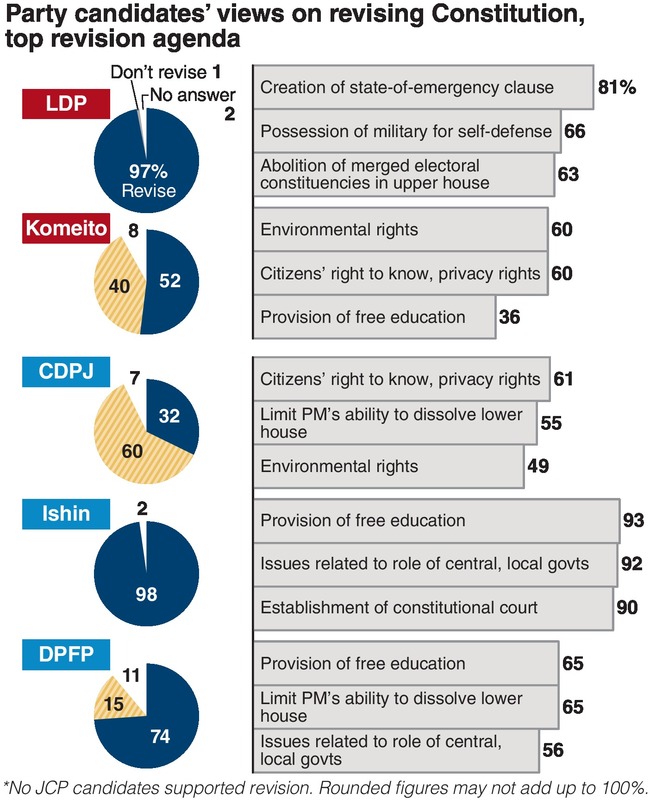 In the survey, the most common answer for the LDP was "creation of a state-of-emergency clause" at 81%. For Ishin, "provision of free education" was at 93% and "issues related to the role of central and local governments" was at 92%. For Komeito, "environmental rights" as well as "citizens' right to know and privacy rights" were at 60%.