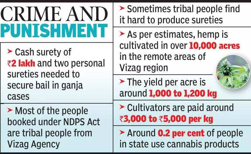 The central prison has 1,950 inmates (convicts and remand prisoners) with most of them facing ganja smuggling cases. Andhra Pradesh has four central prisons located at Vizag, Rajahmundry, Nellore and Kadapa. Lodging capacity at these facilities is 3,764 (3,634 male prisons and 130 female prisoners) but they are filled much beyond that due to various reasons. Speaking to TOI, president of Visakhapatnam Bar Association (VBA), G Maheswara Reddy said the NDPS Act is very stringent and getting bail is difficult in some cases. As per the Act, cases are booked under three categories - smugglers caught with one kg, between 1 kg and 20 kg, and 20 kg and above. For those booked below 1 kg of hemp, getting bail is easy, but for those caught with between one kg and 20 kg and above 20 kg it is difficult, and it may take over six months to get bail, he added