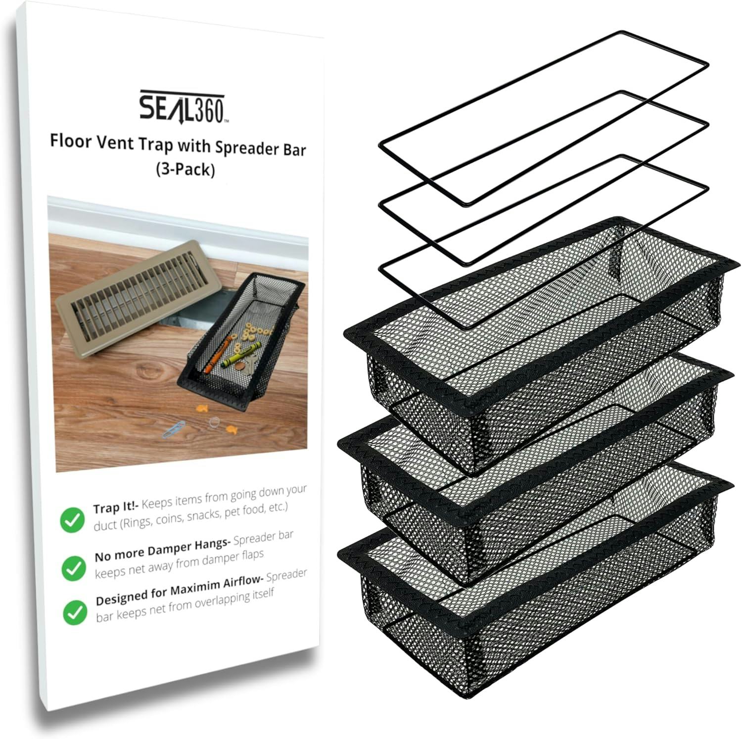Easy-to-install floor vent nets that keep items from falling into the void