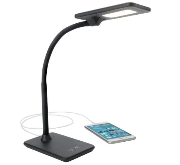 Every workspace needs good light. It also needs a place to charge a phone, headphones, or other tech. This task light does both and takes up very little space. The light emits 400 lumens of bright light — in warm, cool, or daylight colors — so you can read, take notes, draw, or whatever you do. It also has a USB port for charging.