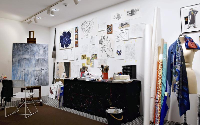 At KH Gallery Ginza in Chuo Ward, Tokyo, visitors can appreciate items such as a dress that looks as if it has been covered in dynamic ink brush strokes, and colorful abstract paintings by Koshino herself.