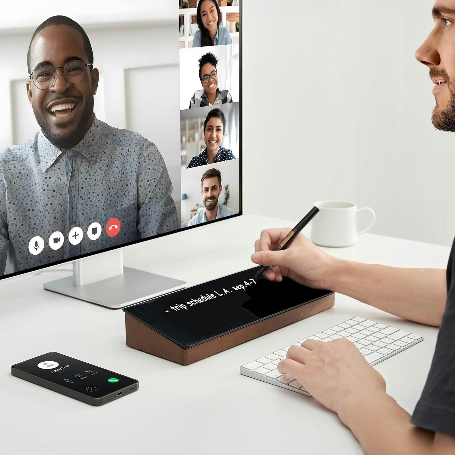 This desktop dry-erase board takes up minimal space while offering maximum writing room, with a wide, angled surface that sits right in front of a keyboard. The base is handcrafted from wood and has space to hold small office supplies, while the tempered glass is perfect for taking notes and comes in black or white.
