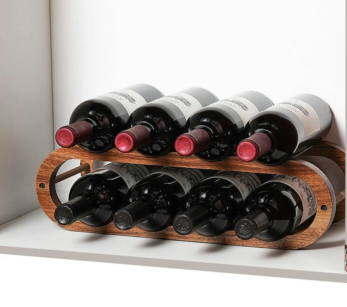 A wooden wine rack that holds up to 8 bottles