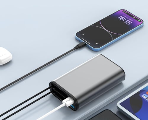 This power bank features retractable charging cables (specifically a USB-C and Lightning cable) built into it so you can quickly charge your devices anywhere, anytime. There are a pair of charging ports as well. See the LED indicator on the side to gauge the remaining battery level and charging status.