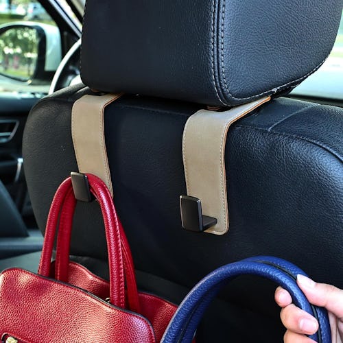 Slide these headrest hooks onto any of your vehicle’s seats, then use the heavy-duty metal hooks to hold groceries, your backpack, extra umbrellas, or other items you don’t want tumbling around on the floor. They can support up to 44 pounds and will work in most vehicles and install without removing the headrest.