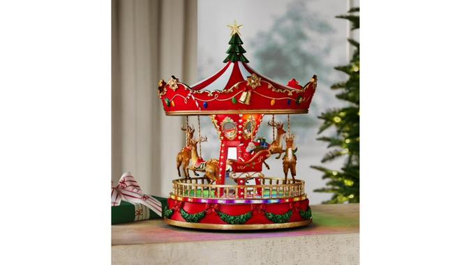 Your family might enjoy this festive musical carousel, which evokes nostalgia and makes for a great centerpiece for your living room table, mantel or another prominent location in your home. It lights up, plays eight Christmas songs, and shows reindeer and Santa on his sleigh. You can conveniently use a USB cable or batteries for power.