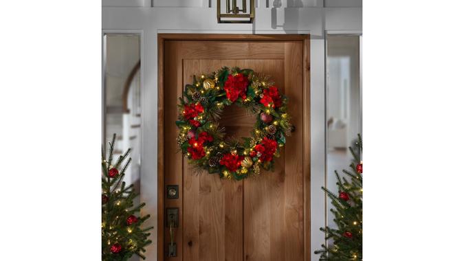 You can’t go wrong with a festive wreath that welcomes visitors, and going the artificial route is great for a tight budget because of reusability. Sam’s Club offers its pre-lit 32-inch decorated wreath in a red version with flowers, berries and magnolia leaves and an evergreen version with pinecones and various ornaments. Both wreaths include a timer and run on AA batteries.