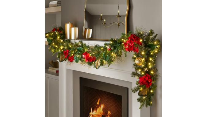 Sam’s Club sells some 9-foot pre-lit decorated garland in red and evergreen color options that complement the decorated wreath highlighted above. The faux yet realistic garland is great to reuse every Christmas so you can easily decorate your stairs, fireplace mantel, window or doorway. You can also safely place it in a covered area outside, such as on your porch.