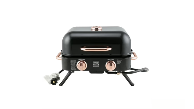 The Kenmore two-burner portable tabletop retro gas grill from Walmart blends 20th century style with the practicality campers expect today. Nearly pre-assembled (just screw in the side handles), this handy camp grill can grill up to nine burgers at a time, delivering 14,000 BTUs of power through a portable propane tank.