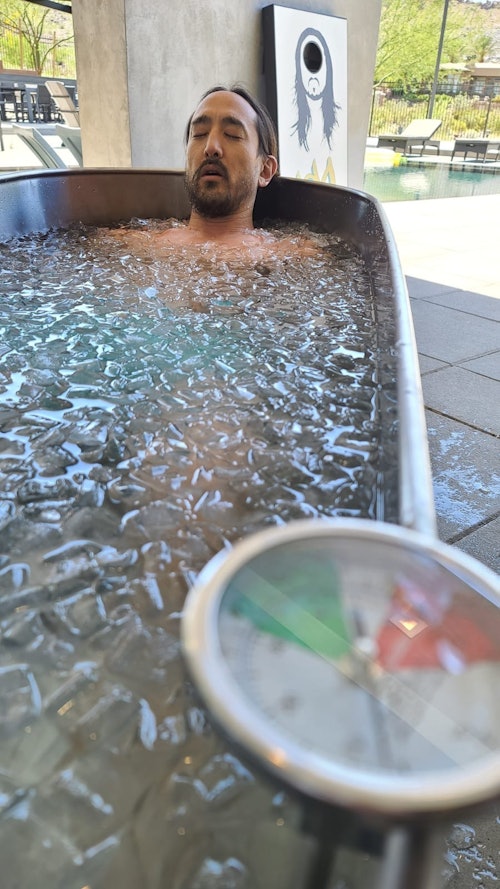 I started my day doing the cold plunge. Basically, I fill that tub with ice and water. It’s about 34 or 35 degrees. And you sit in there. You learn how to control your mind, to deal with situations that you think you can’t control. It’s healthy to shock your body like that. I leave really excited, really inspired. It gets me going through the day.