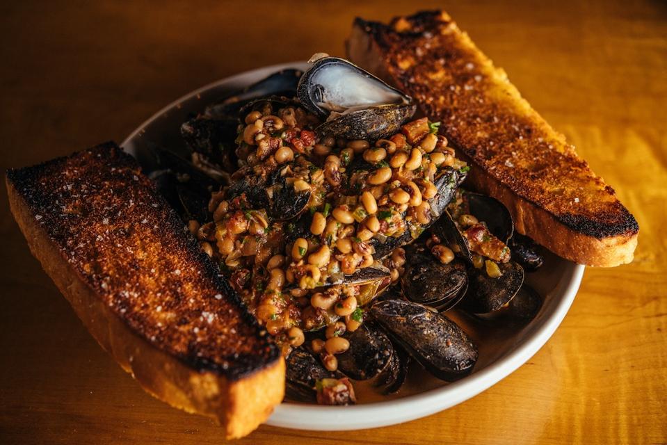 This dish at Toups Meatery, the contemporary Cajun eatery in New Orleans from three-time James Beard Awards finalist for Best Chef: South and Top Chef Season 13 Fan Favorite Chef Isaac Toups, is served with bacon, pickled jalapeno, and garlic focaccia. According to Isaac, "Black eyed peas are good luck and a Southern tradition. I always keep them on the menu and change up the preparation. Right now at Toups Meatery, we serve black-eyed peas with mussels and garlic focaccia for scooping/dipping. It's an excellent time to eat black-eyed peas, especially during New Year’s Eve to bring in good fortune for 2022!"