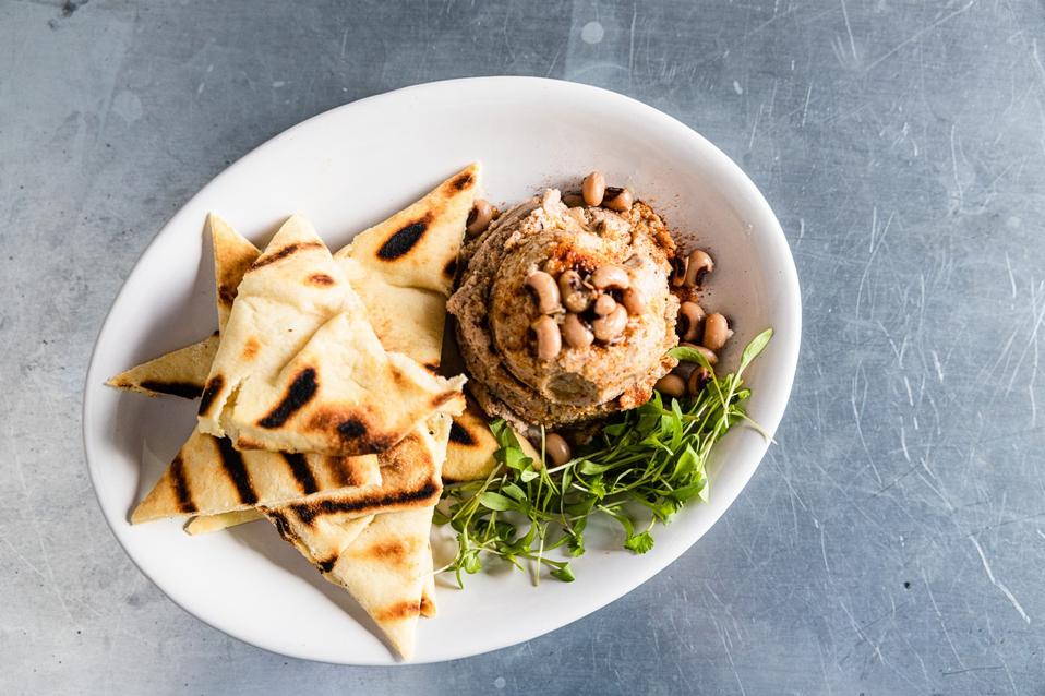 At Bourbon in Columbia, South Carolina, there’s a fun variation on hummus made with black eyed peas! “Although we serve an amped-up version of the ‘traditional’ New Year’s Day meal of pork, collards and black-eyed peas, my favorite is our Black Eyed Pea Hummus. Black eyed peas aren’t exactly the best of the peas, in my opinion. I’d prefer a Sea Island Red Pea or the creamy, white Rice Pea, but when blended with local benne seed tahini and plenty of Georgia-grown olive oil, garlic and a splash of lemon juice, black-eyed peas become a truly delicious hummus that’s fun to enjoy with everyone. Just grill some flatbread and dig in,” said chef Kristian Niemi, who is also the owner.