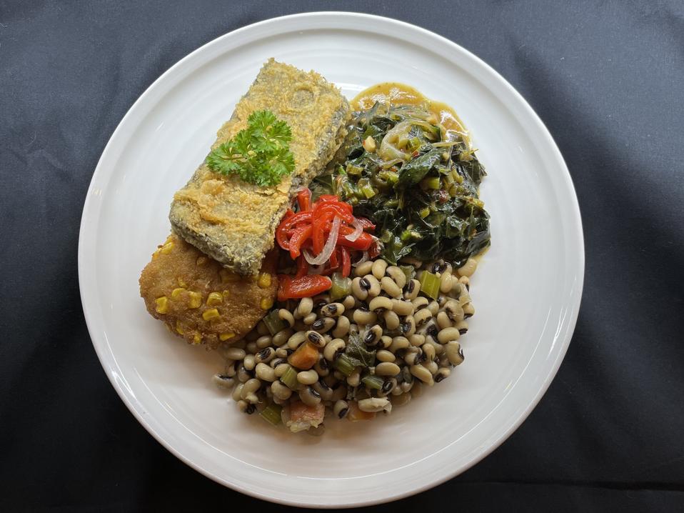 At The Plot in Oceanside, California, this is a southern fried “meatless" loaf with black eyed peas and collards. The Plot’s lentil and wild rice meatless loaf is “southern-fried” and includes fresh black-eyed peas that are boiled in The Plot's veggie broth, seasoned, and served alongside collard greens fresh from The Plot garden and a celeriac pulp and sweet corn fritter. “it’s meaningful to me because it pays respect to one of my favorite classics. Not only do the peas symbolize good luck, the collard greens money and the corn gold but the components are comforting on a cold winter day/night. On top of all of this, if you overindulged on New Year’s Eve the night before, this is a nourishing, healthier version of an age-old classic that will counter the effects of last night’s celebration,” said chef/owner Davin Waite.