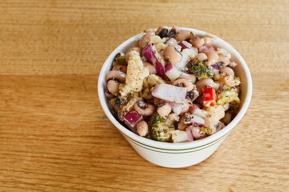At Bluebird Barbecue in Burlington, Vermont, which is helmed by James Beard-nominated chef turned 'head coach' Sue Bette, this salad includes soaked, salted + slow simmered black eyed peas tossed with grilled broccoli and cauliflower, diced red onion and bell pepper, dressed with charred lemon vinaigrette. "This zippy, light, + healthy salad is a great dish to enjoy on New Year's Day and kick off your New Year's wellness resolution, not to mention a little good luck! It also keeps well so you can pack for lunch for the return to work. It makes a great topping for a composed salad or bowl. Charring the lemon brings a sweet element to balance the lemon's natural acidity, so it's a zingy balanced dressing. At Bluebird, we serve this chilled but it can easily be warmed and enjoyed," said head chef Dan Miele.