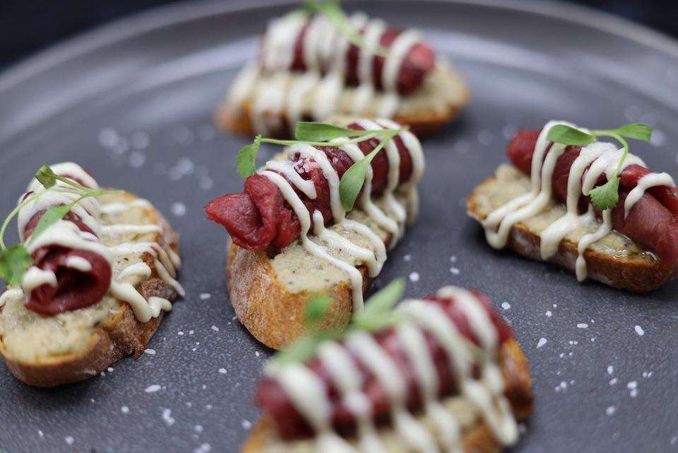 At Charm Bar & Restaurant in Brooklyn, New York, this beautiful appetizer involves toasted butter crostini, black eyed pea hummus, salted filet mignon carpaccio, drizzled with creamy horseradish, olive oil, garnished with micro cilantro. “Eat with joy and receive luck with good nourishment,” said chef Christopher Callender.