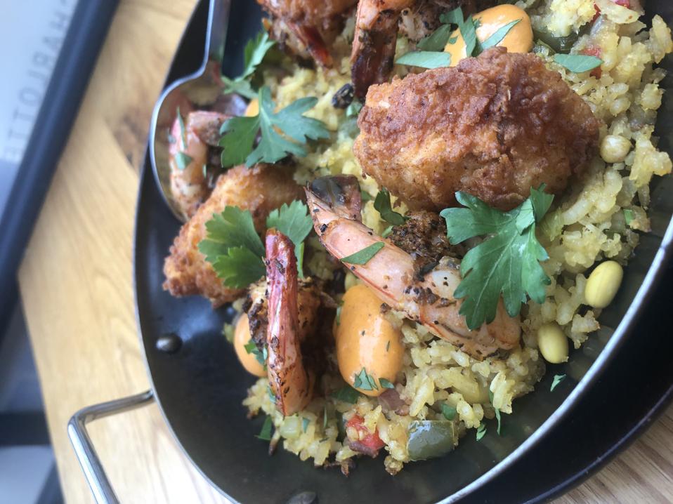 At BOCADO Bar & Diner in Charlotte, North Carolina, Tha Down South’ hoppin john paella is served with Marsh & Mill black eyed peas, east coast shrimp, fried Carolina catfish and Carolina gold rice. "This is a great dish to share as a group – paella brings people together to share and hoppin john with the black eyed peas symbolizes southern food and all its deliciousness," said executive chef Brett Faldstein.