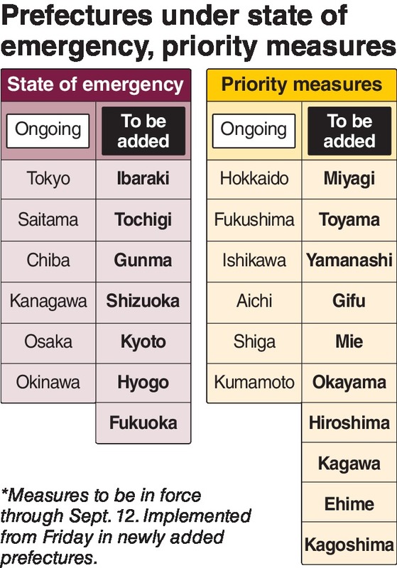 The seven prefectures are Ibaraki, Tochigi, Gunma, Shizuoka, Kyoto, Hyogo and Fukuoka, all of which are currently under priority measures. The state of emergency that is currently set to continue in Tokyo and five other prefectures until Aug. 31 will be extended through Sept. 12,
