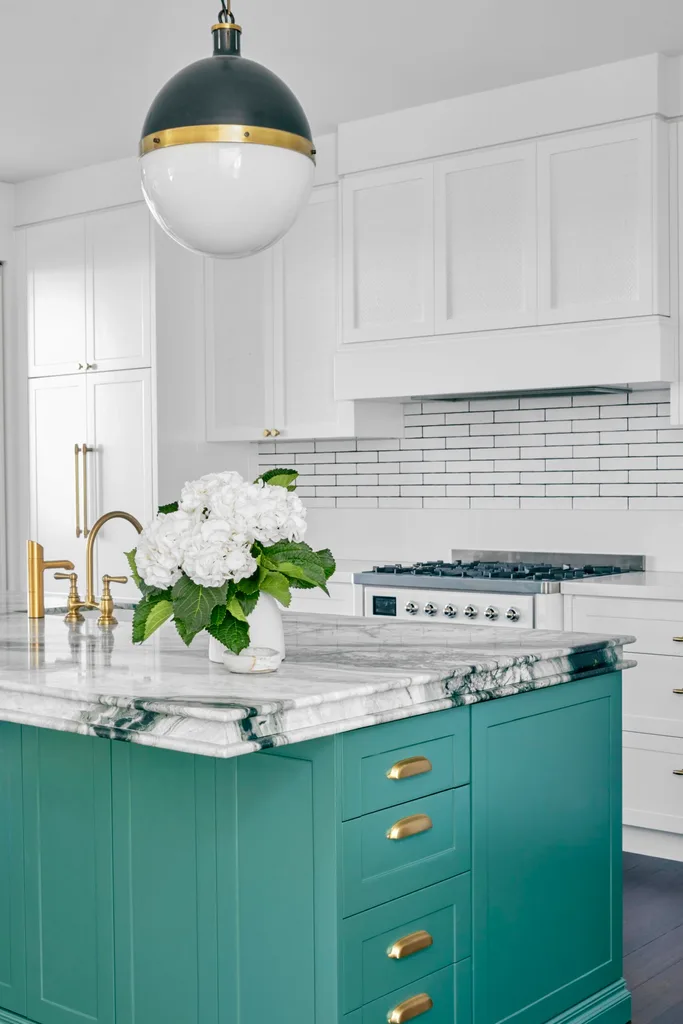 Since natural stone is at the higher end of the price range, interior designer Danielle Bonello suggests contrasting it with another material, “so that your natural stone island pops and becomes the feature.”